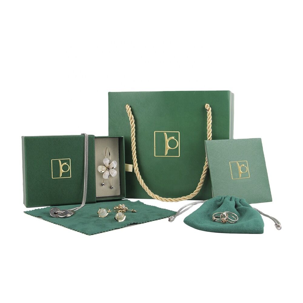 This green color drawer sets including ring, earring, pendant, necklace box, jewelry paper bag and pouch, excellent workmanship