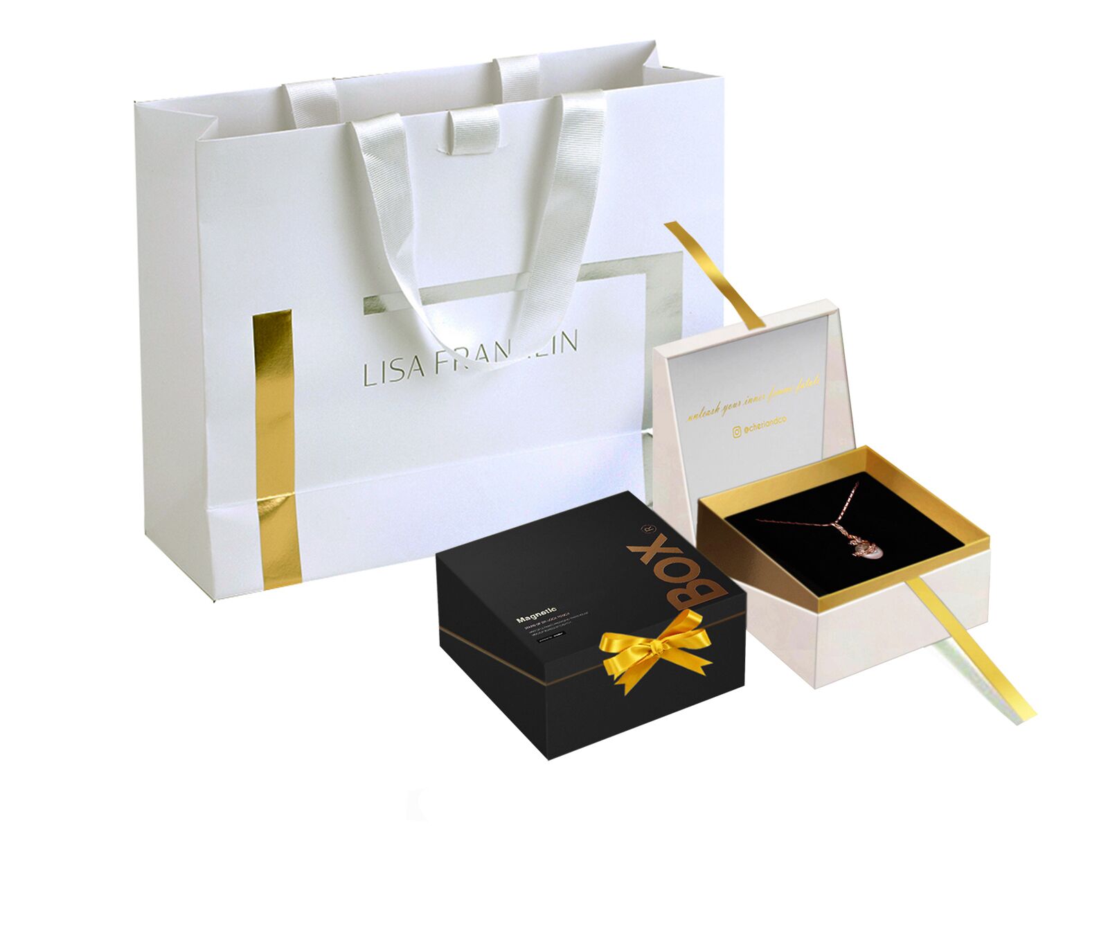 Rose gold logo luxury magnetic wedding double ring, necklace packaging box, with ribbon and matching paper bag