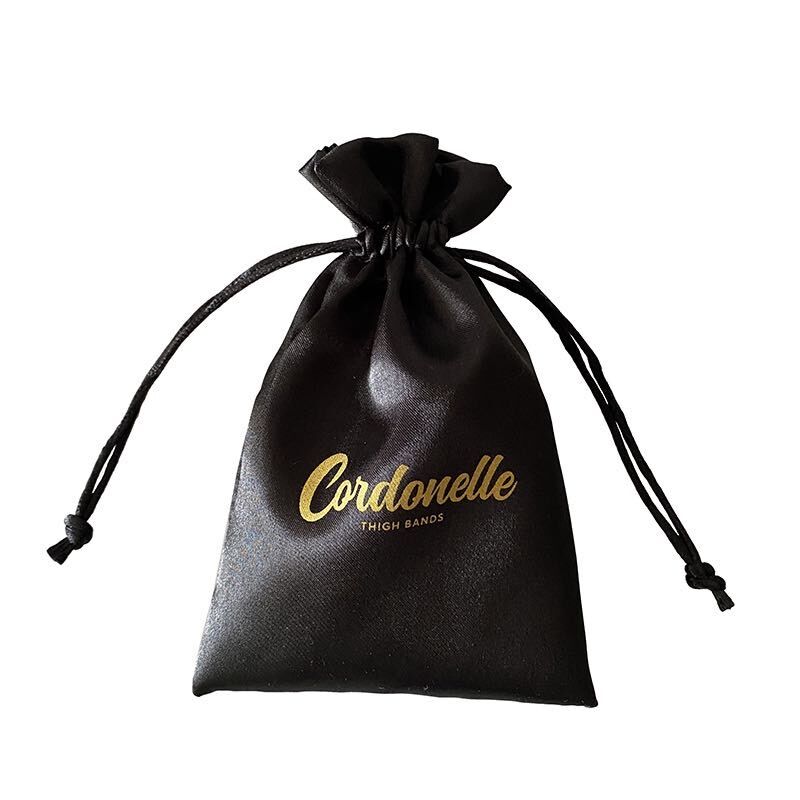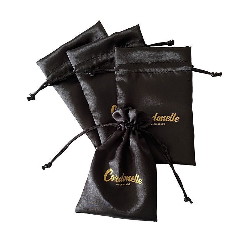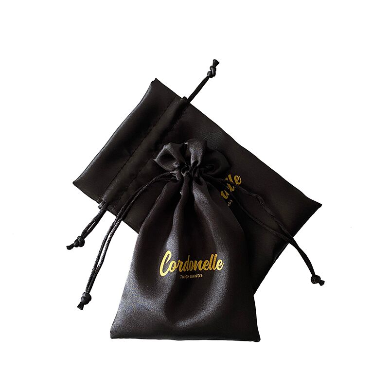 Recyclable Gold Logo Black Satin Drawstring Gift Bag